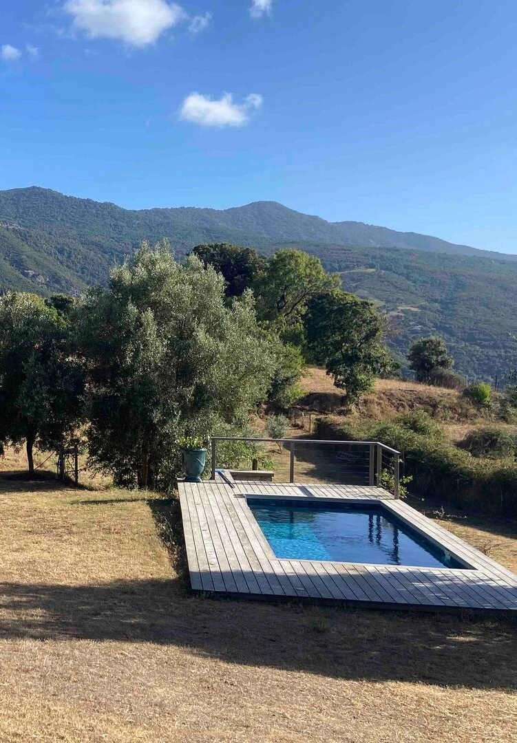 Au cœur d’un cadre verdoyant, la Bergerie Curatoggio se pare d’une superbe piscine à sel en émaux bleus, entourée d'une terrasse en teck rejoignant la maison. Au cœur du jardin planté d’oliviers, un salon confortable et ombragé vous propose un lieu de farniente. Un endroit parfait quand la chaleur de l’été insulaire se fait douce. À l’abri du soleil, chaque instant se savoure dans ce décor apaisant.